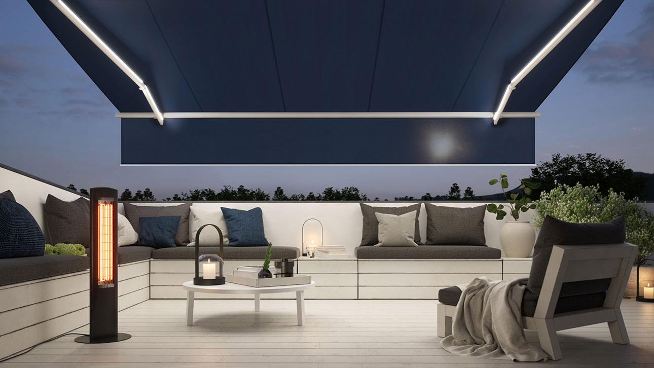 Selbstbewusst und schick präsentiert sich die markilux MX-4, eingebettet in eine geschlossene Kassette mit umlaufender Sichtblende. Maßgeschneidert für die Beschattung großer Flächen, überzeugt sie mit einem avantgardistischen Design und fortschrittlichen Beleuchtungsmöglichkeiten.