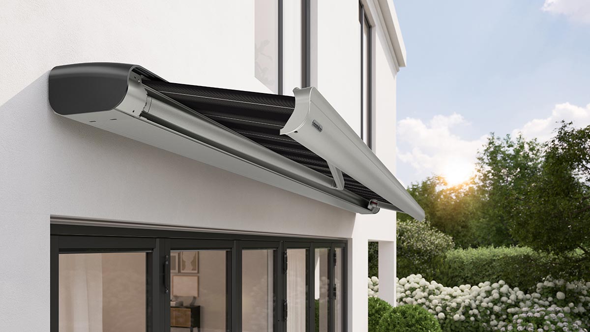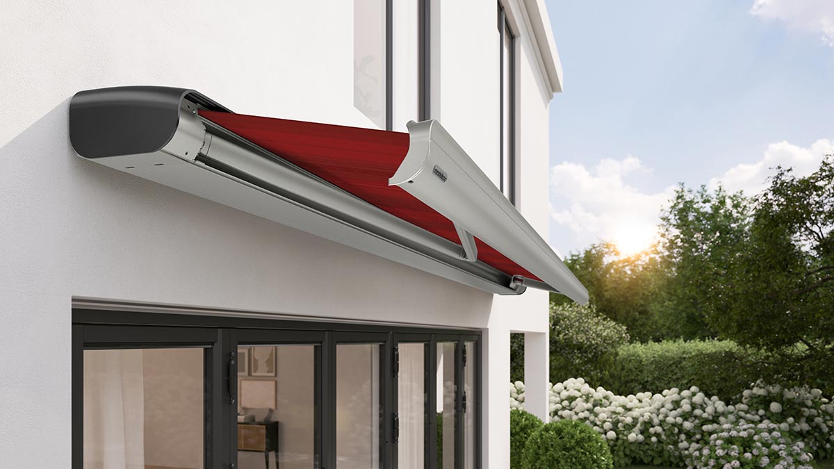 Der patentierte Schwenkmechanismus und die neigungsunabhängige Einfahrposition der einzigartigen markilux 930 eignen sich perfekt für Dachvorsprünge oder Balkone.