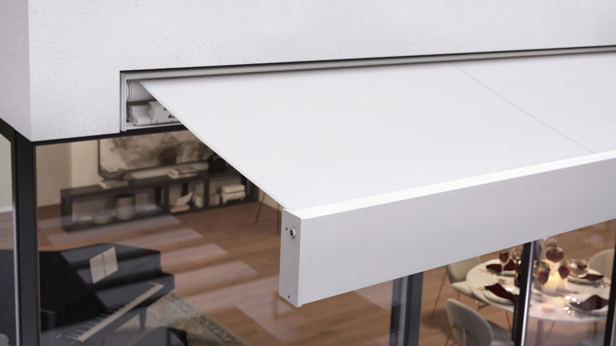 Die funktionale eckige Markise ist optimal für die Integration unter Vorbauten oder in Nischen geeignet. Je nach Bausituation verschwindet das schlanke Ausfallprofil entweder vollständig in der Wand oder liegt bündig mit der Fassade.