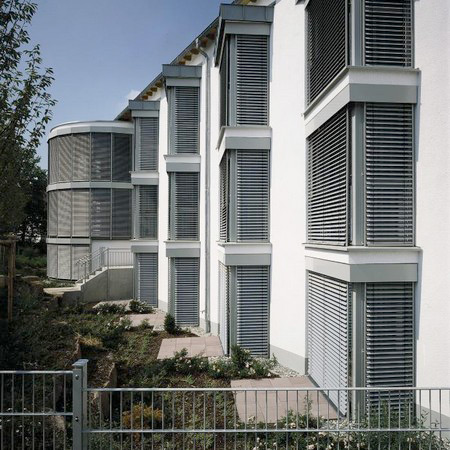 Raffstore mit gebördelten Lamellen sind die gängigsten Außenraffstore. Vorwiegend in Gewerbebauten zu finden, werden sie mehr und mehr auch im Wohnhausbau eingesetzt - wie auch die Warema Vorbau-Raffstore.